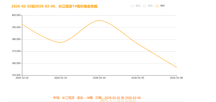 2026年2月2日至6日当周,长江现货市场1#锡价呈现典型的“冲高回落、加速下跌”走势,市场情绪由谨慎转向明显悲观。全周均价为379,800元/吨,累计大幅下跌13,400元/吨,跌幅显著。具体来看,周初市场表现疲软,周一(2月2日)价格即出现下跌。随后在周二(2月3日)出现技术性反弹,均价升至390,250元/吨的周内高点,但涨势未能持续。关键的转折发生在周三(2月4日)之后,锡价掉头向下并进入连续下跌通道,且跌幅逐日扩大,形成清晰的“倒V型”反转。尤其是周四和周五,单日跌幅加剧,最终在周五(2月6日)均价跌至周内最低点371,250元/吨。